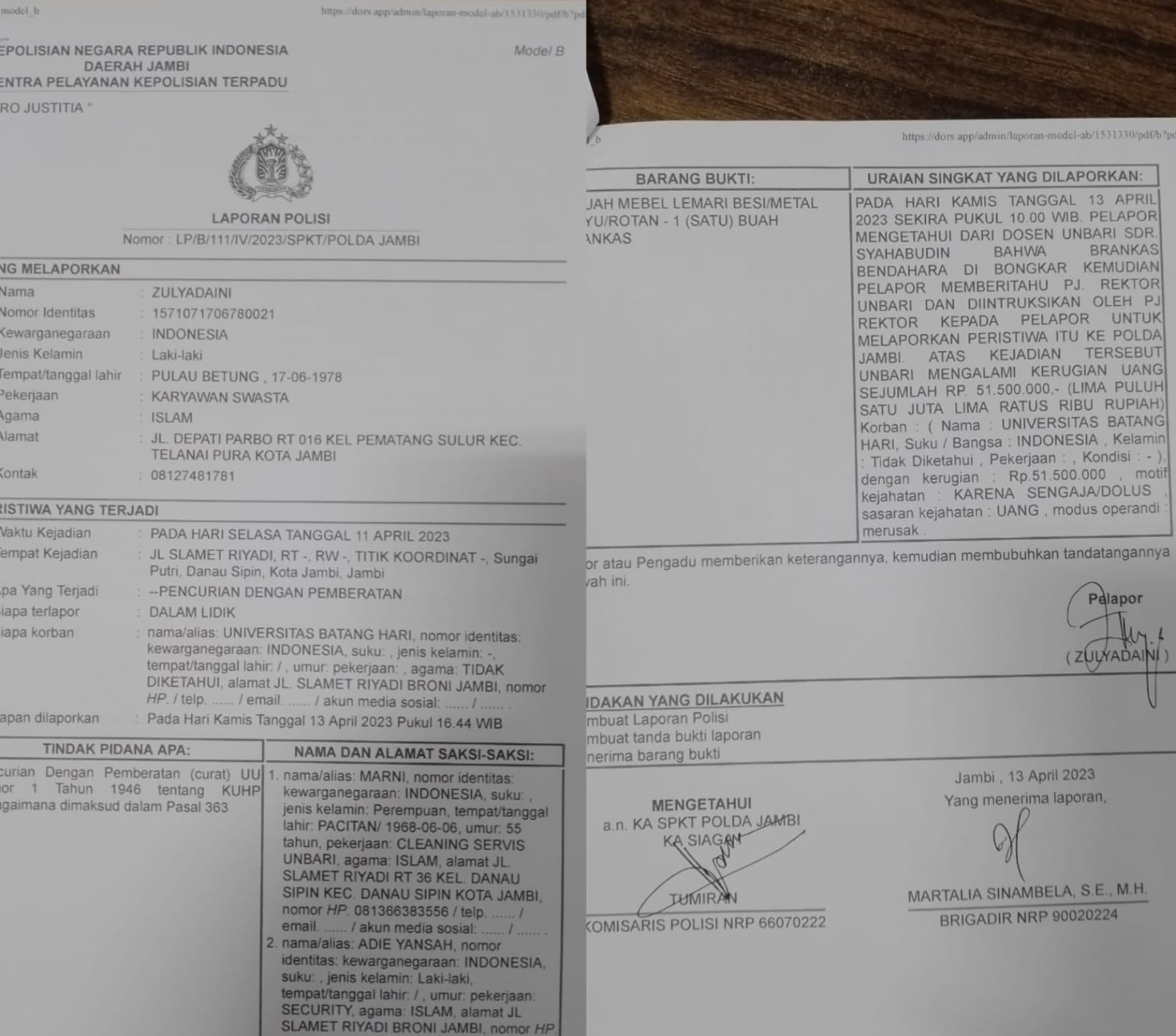 Patriotik.co – Terjadi aksi pembobolan brankas Bendahara Universitas Batanghari (Unbari) Jambi yang pada Rabu (12/04/2023) kemarin saat ruangan kosong. Dimana saat ini ada kehilangan sejumlah uang sekitar Rp. 51.500.000 dan beberapa dokumen penting Unbari.